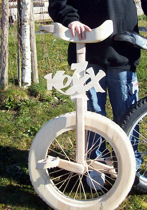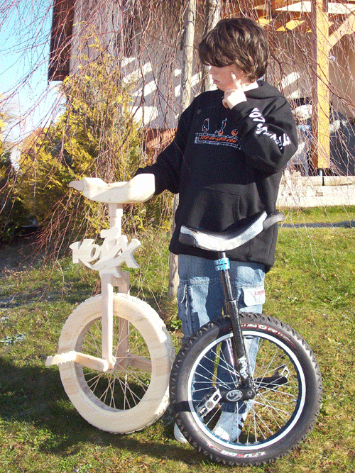 Yann réalise divers objets en bois par exemple ce monocycle. Sur la photo, son fils Yohann.